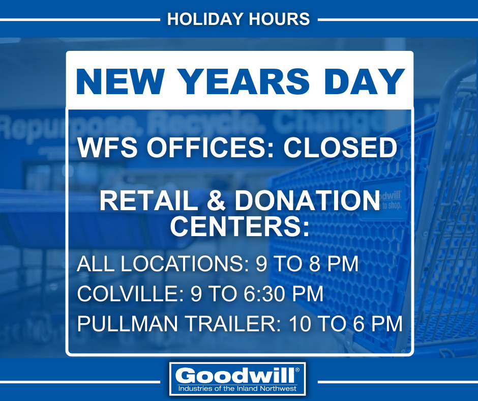 Ring in the new year with Goodwill Industries of the Inland Northwest! Our administrative and Workforce & Family Services offices will be closed on January 1, but there’s still time to donate and shop! All Goodwill stores and donation centers will be OPEN and operating at regular hours. Find your nearest store: https://discovergoodwill.org/lets-shop/goodwill-stores/