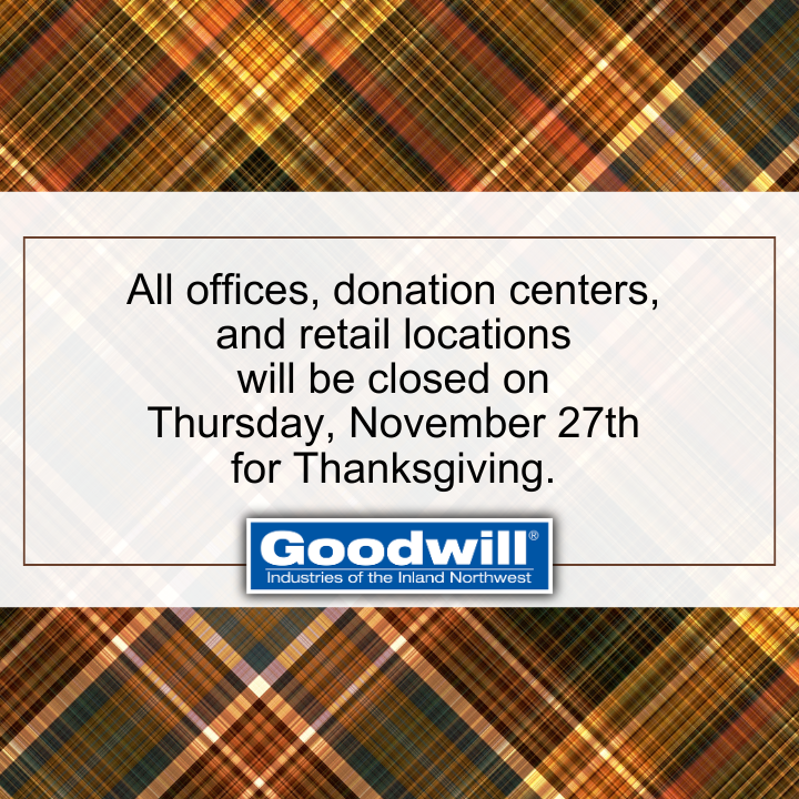 All Goodwill Locations Closed on Thursday, November 27 for Thanksgiving In celebration of Thanksgiving, all Goodwill Industries of the Inland Northwest retail stores, donation centers, administration, and career and resource centers will be closed on Thursday, November 27. This closure allows our team members to enjoy the holiday with their families and loved ones. […]