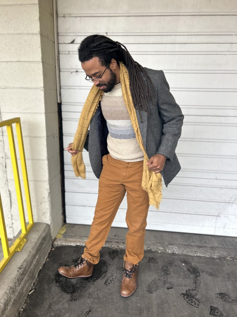 A neutral-toned sweater, like brown or tan, adds warmth and texture. It’s the ideal middle layer under your blazer. Bonus: sweaters are easy to find at any Goodwill during seasonal sales. Ours was just $7.99.