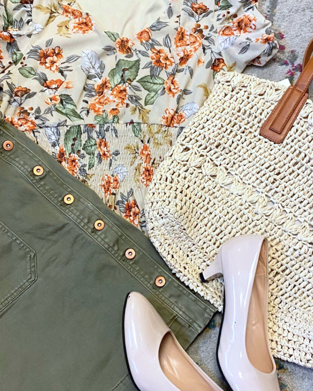 To match that energy, I elevated the outfit just a bit. I swapped casual for business casual with a skirt and simple heels, and everything came together effortlessly. The boho bag added the perfect finishing touch, but the real standout is the green skirt. It pulls all the tones from the top and ties the whole look together in such an intentional way.