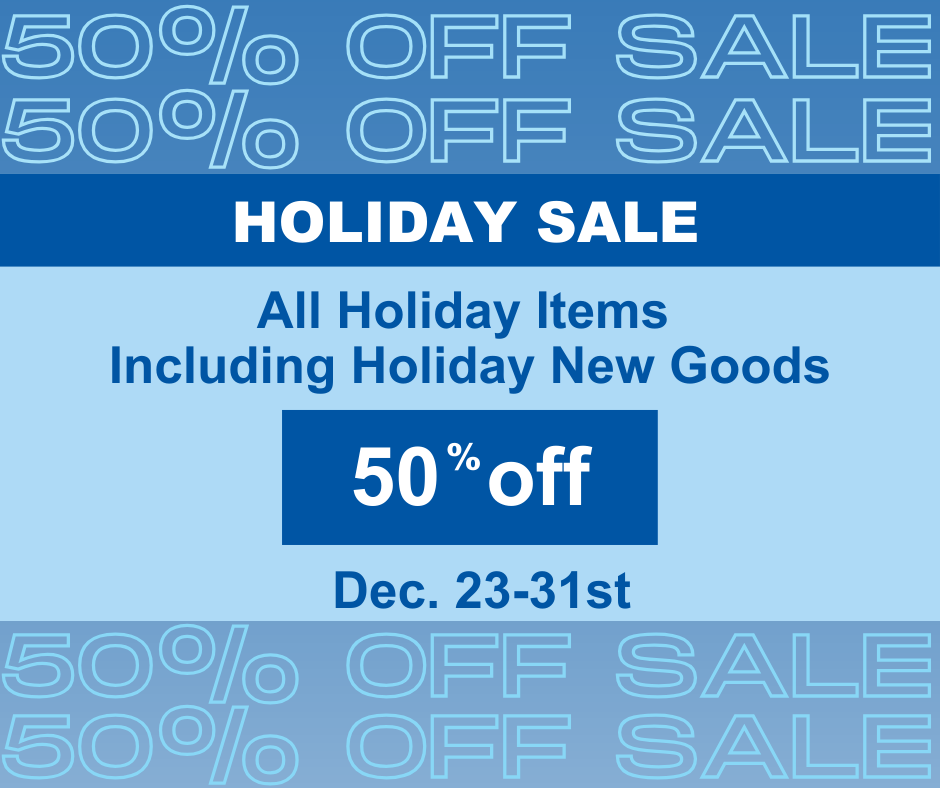 Holiday Cheer Alert!  From Tuesday, December 23rd through Wednesday, December 31st, we’re spreading joy with an amazing Holiday Sale! ALL holiday items, including our brand-new festive goods, are 50% OFF! Stock up on seasonal favorites, snag those last-minute gifts, and make your holidays sparkle without breaking the bank. Hurry! These deals melt away when the clock strikes midnight