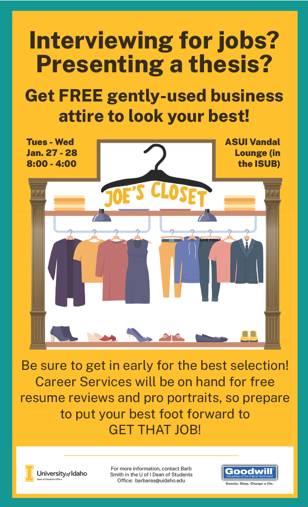 University of Idaho students can get FREE gently-used business attire at Joe’s Closet, a partnership with the University of Idaho Division of Student Affairs and Goodwill. Perfect for interviews, presentations, and thesis defenses. Plus resume reviews and pro portraits.