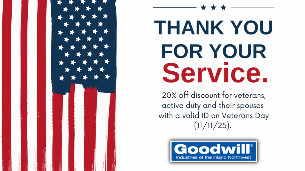 Honoring Veterans Day with Gratitude and a 20% Military Discount  This Veterans Day, Goodwill Industries of the Inland Northwest proudly honors the service and sacrifice of our nation’s veterans, active-duty military personnel, and their families. On Tuesday, November 11, all shoppers with a valid military ID will receive a 20% discount at any of […]